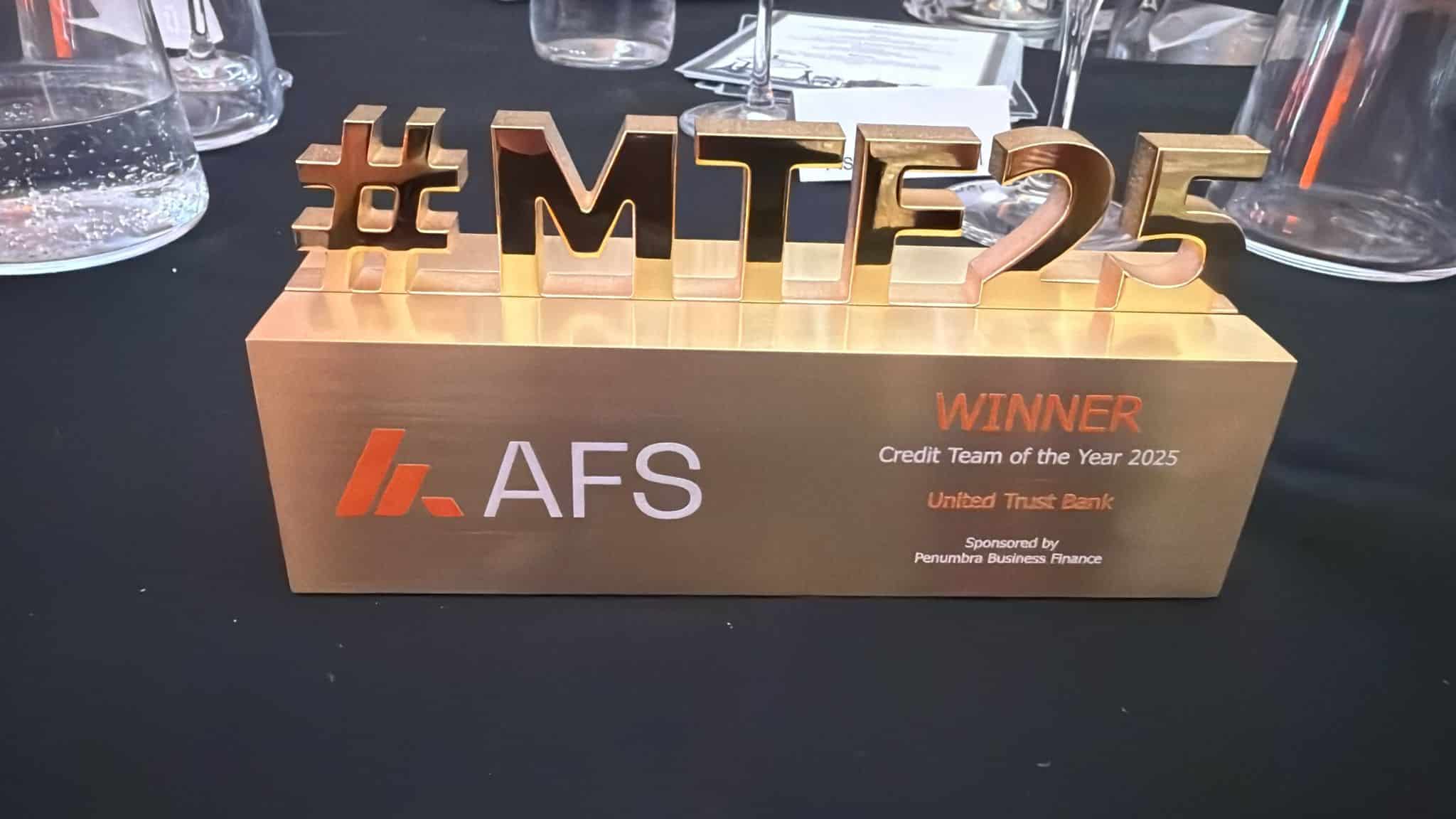 United Trust Bank (UTB) has won the Asset Finance Credit Team of the Year Award at the Asset Finance Solutions (AFS) Meet the Funder Expo for the second year running. The win comes just over a week after the same team won the Underwriting Team of the Year award at the NACFB Commercial Lender Awards 2025.