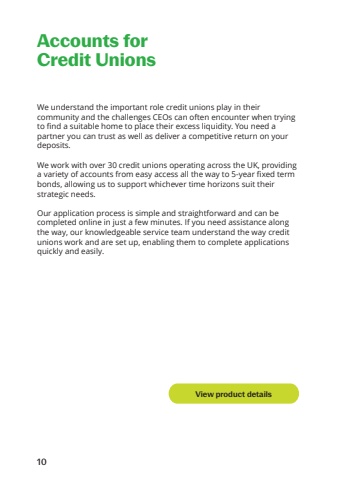 Accounts forCredit UnionsWe understand the important role credit unions play in their community and the challenges CEOs can often encounter when trying to find a suitable home to place their excess liquidity. You need a partner you can trust as well as deliver a competitive return on your deposits. We work with over 30 credit unions operating across the UK, providing a variety of accounts from easy access all the way to 5-year fixed term bonds, allowing us to support whichever time horizons suit their strategic needs. Our application process is simple and straightforward and can be completed online in just a few minutes. If you need assistance along the way, our knowledgeable service team understand the way credit unions work and are set up, enabling them to complete applications quickly and easily. 10View product details