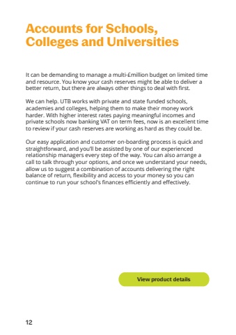 Accounts for Schools,Colleges and UniversitiesIt can be demanding to manage a multi-%u00a3million budget on limited timeand resource. You know your cash reserves might be able to deliver abetter return, but there are always other things to deal with first.We can help. UTB works with private and state funded schools, academies and colleges, helping them to make their money work harder. With higher interest rates paying meaningful incomes and private schools now banking VAT on term fees, now is an excellent time to review if your cash reserves are working as hard as they could be. Our easy application and customer on-boarding process is quick and straightforward, and you%u2019ll be assisted by one of our experienced relationship managers every step of the way. You can also arrange a call to talk through your options, and once we understand your needs, allow us to suggest a combination of accounts delivering the right balance of return, flexibility and access to your money so you can continue to run your school%u2019s finances efficiently and effectively. 12View product details