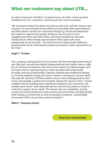 What our customers say about UTB%u2026As well as having an 'Excellent' Trustpilot score, we often receive positivefeedback from our customers. Here are just two recent examples:%u201cWe have found United Trust Bank very easy to work with, and their interest ratesare good. It%u2019s a personalised service where you%u2019re provided with email addressesand direct phone numbers for real human beings (e.g. Nicola and Stephanie!)who attend to requests very quickly. Setting up new accounts is morestraightforward than with other banks, and online banking has now beenintroduced too. We%u2019ve already recommended UTB to others who havesubsequently set up accounts. The interest we earn helps provide additionalfunding which can be used towards property purchases or other requirements ofthe Trust.%u201dHugh S - Trustee%u201cAs a company, having placed all our business with the same high street bank forover fifty years, we were persistently disappointed with the interest rates on offerfor our hard-earned balances. We came across United Trust Bank through wordof mouth, and our opening enquiry to them was dealt with exceptionallypromptly, and very professionally. A specific individual was assigned to helpingus, and they showed a strong and sincere interest in winning our account, whichthey duly did. Now that UTB have added a secure online banking portal to theirservice, the package is perfect and complete. Despite the move to online, I remainconfident that for anything which requires the assistance of a real person, theexcellent team which I have dealt with will be at the end of a phone or email tocontinue to support all our needs. The interest rates are competitive, and thevariety of accounts (of which we have several to ensure we have cash flow fluiditywhile making our funds work as hard as possible) is extensive. I would highlyrecommend UTB to any business without hesitation.%u201dMike P %u2013 Business Owner16Read more testimonials
